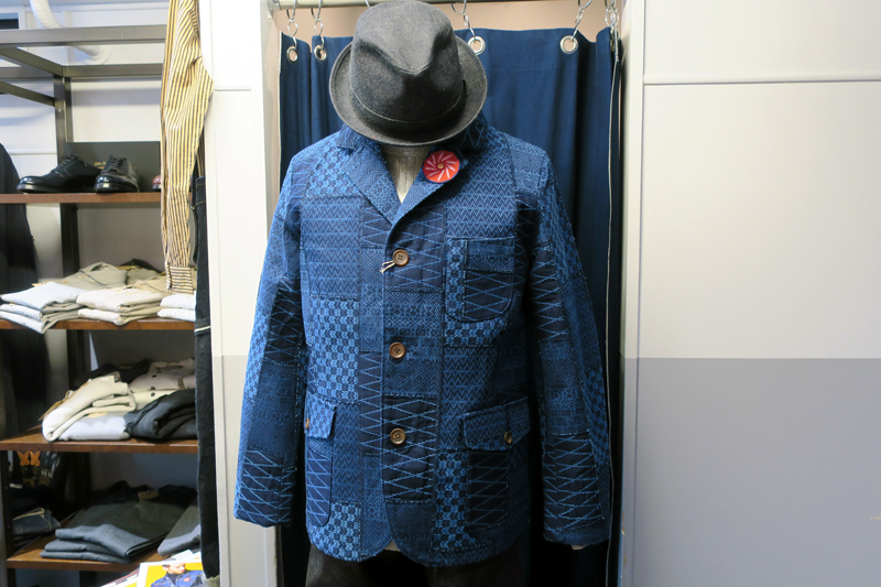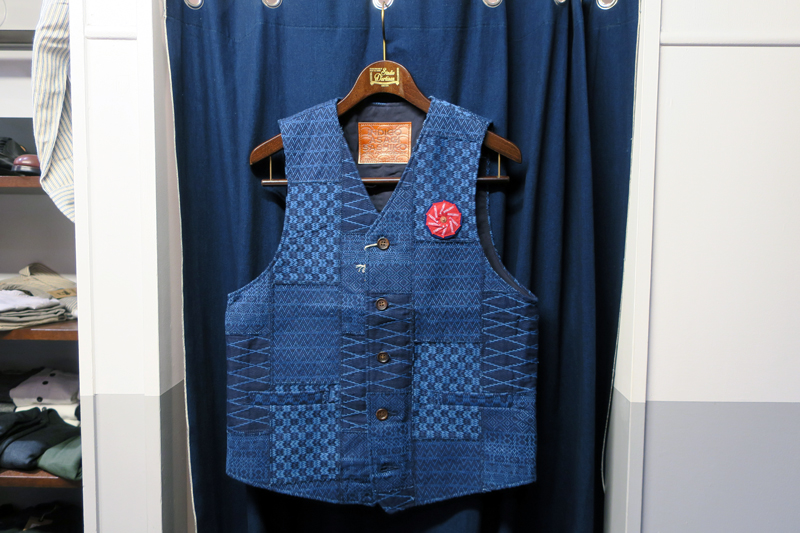 刺し子生地を手作業で並べお作りしたテーラードジャケットとベスト。