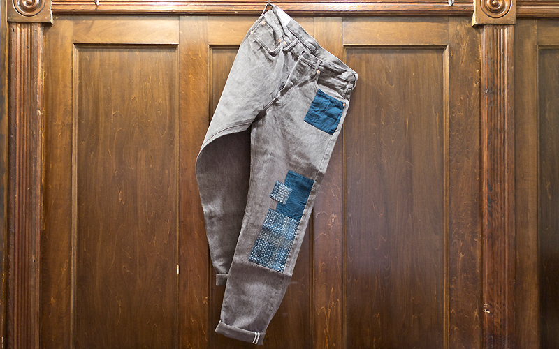 泥染めDenim生地と野良着刺し子PatchworkのJeansとOpen Collar Typeの刺し子Shirtの2Model、